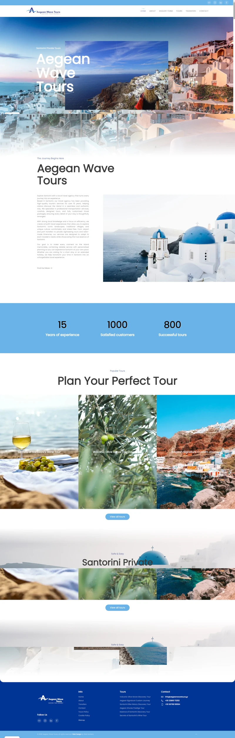 Η Web-Builders σχεδίασε και υλοποίησε το επίσημο website για την Aegean Wave Tours, μια εξειδικευμένη ταξιδιωτική εταιρεία που προσφέρει θαλάσσιες εμπειρίες, εκδρομές με σκάφος και ναυλωμένες περιηγήσεις στο Αιγαίο Πέλαγος. Το project ενσωματώνει την ανάγκη της επιχείρησης να παρουσιάσει με ζωντανό, λειτουργικό και ευανάγνωστο τρόπο το πλήρες φάσμα των δραστηριοτήτων της, δίνοντας έμφαση στην εικόνα, την εμπειρία και την άμεση κράτηση online.