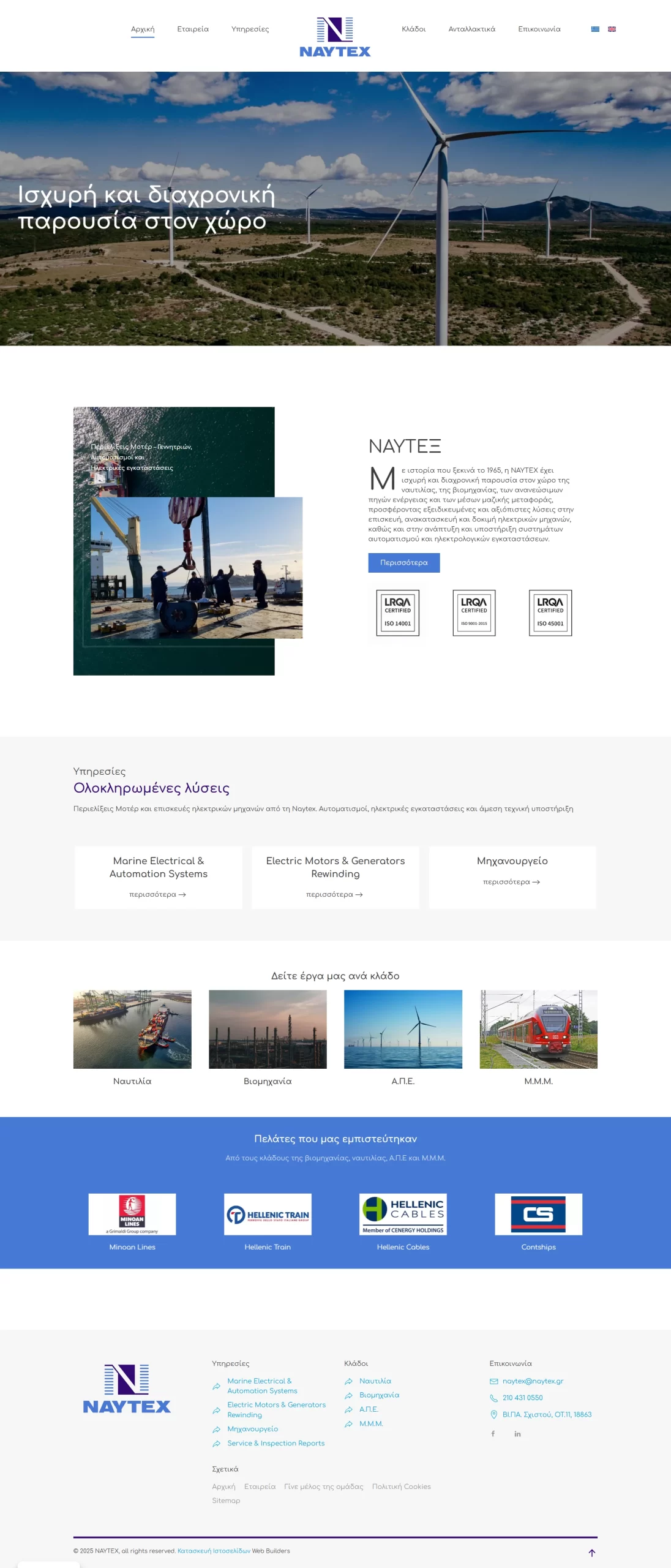 Από το 1965 η NAYTEX έχει ισχυρή και διαχρονική παρουσία στον χώρο της ναυτιλίας, της βιομηχανίας, των ανανεώσιμων πηγών ενέργειας και των μέσων μαζικής μεταφοράς, προσφέροντας εξειδικευμένες και αξιόπιστες λύσεις στην επισκευή, ανακατασκευή και δοκιμή ηλεκτρικών μηχανών, καθώς και στην ανάπτυξη και υποστήριξη συστημάτων αυτοματισμού και ηλεκτρολογικών εγκαταστάσεων